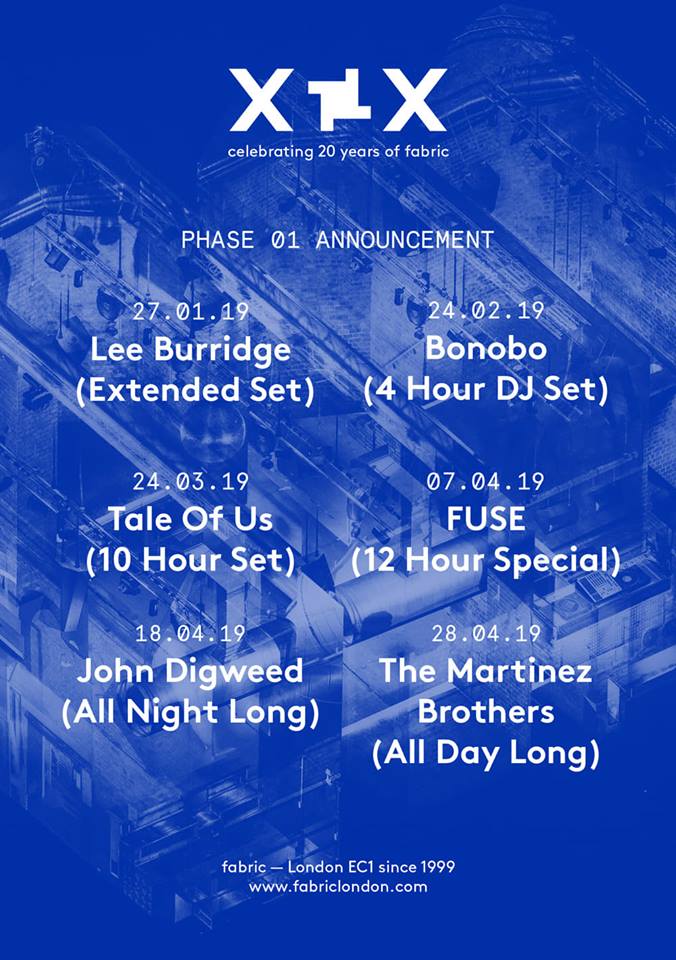 Jak się okazuje, były to jednak przygotowywania do dwudziestych urodzin, które Fabric będzie obchodził w tym roku. Z tej okazji zaplanowano specjalne imprezy podczas których będzie można usłyszeć m.in. dziesięciogodzinny set Tale Of Us.