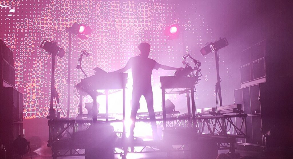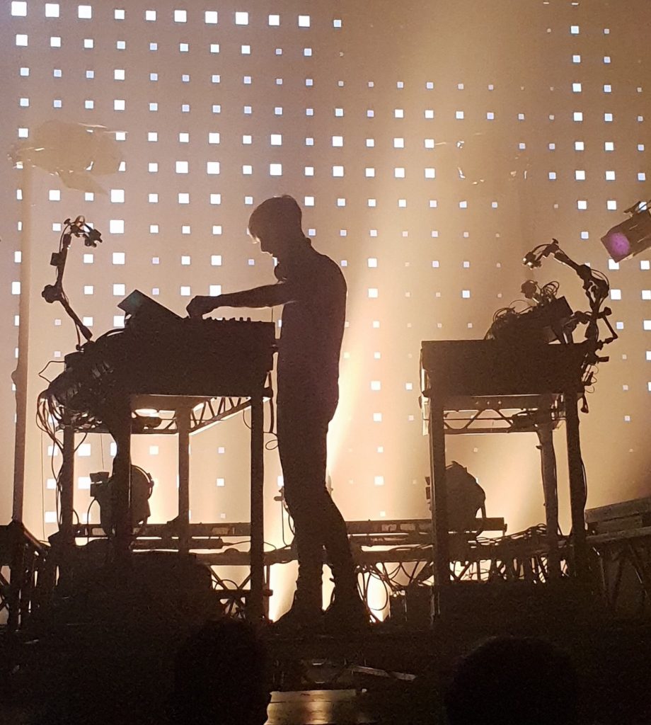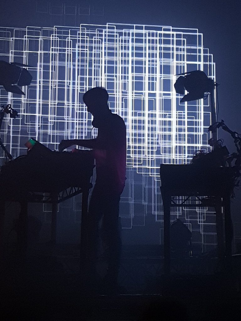 Całość tego obrazu tworzyła wizualizacje i świetnie pasowała z muzyką. Do tego jego „ołtarz” był otoczony wielkimi głośnikami, po 10 z każdej strony i po kilka małych dookoła. Momentami wydawało się, że Hawtin bawi się w tym epicentrum wszechświata sam i przeżywa swoją muzykę bez nas. Momentami jednak przypominał sobie o publice, odwracał się w jej stronę i skakał… trochę jak ze szczęścia. Całe show to jednak rzecz fenomenalna.
