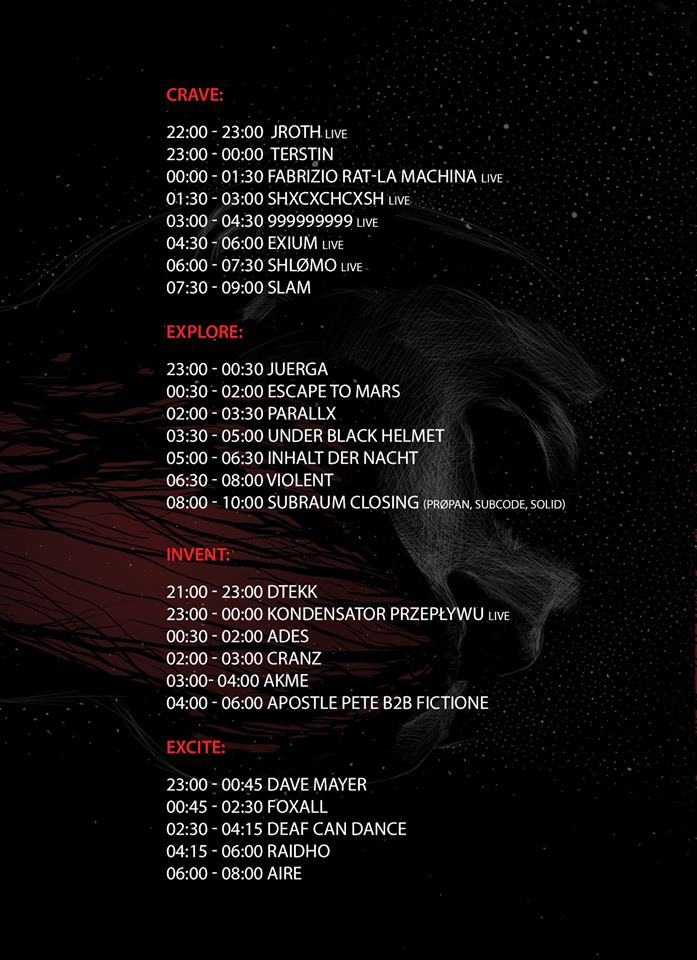 Revive i Subraum Records zapraszają na głośną inaugurację kolejnego sezonu festiwalowego! Przed Wami niesamowite wydarzenie audio-wizualne, na którym zaprezentują się topowi artyści zarówno międzynarodowej, jak i rodzimej sceny muzyki elektronicznej. Sprawdźcie kto o której gra.