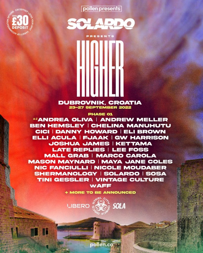 Trzeba przyznać, że patrząc na mające się odbyć tam wydarzenia – jest w czym wybierać. Kolejnym ciekawie zapowiadającym się efektem jest event Higher. Marco Carola, FJAAK, Nicole Moudaber, Mall Grab, Maya Jane Coles, Vintage Culture, Nic Fanciulli czy Lee Foss, to tylko niektórzy z wielu artystów, którzy w dniach 23. -27. września zagrają w Dubrowniku. Miejscu znanym z „Gry o Tron” i będącym jednym z najchętniej odwiedzanych przez rodaków miast w tej części Europy.